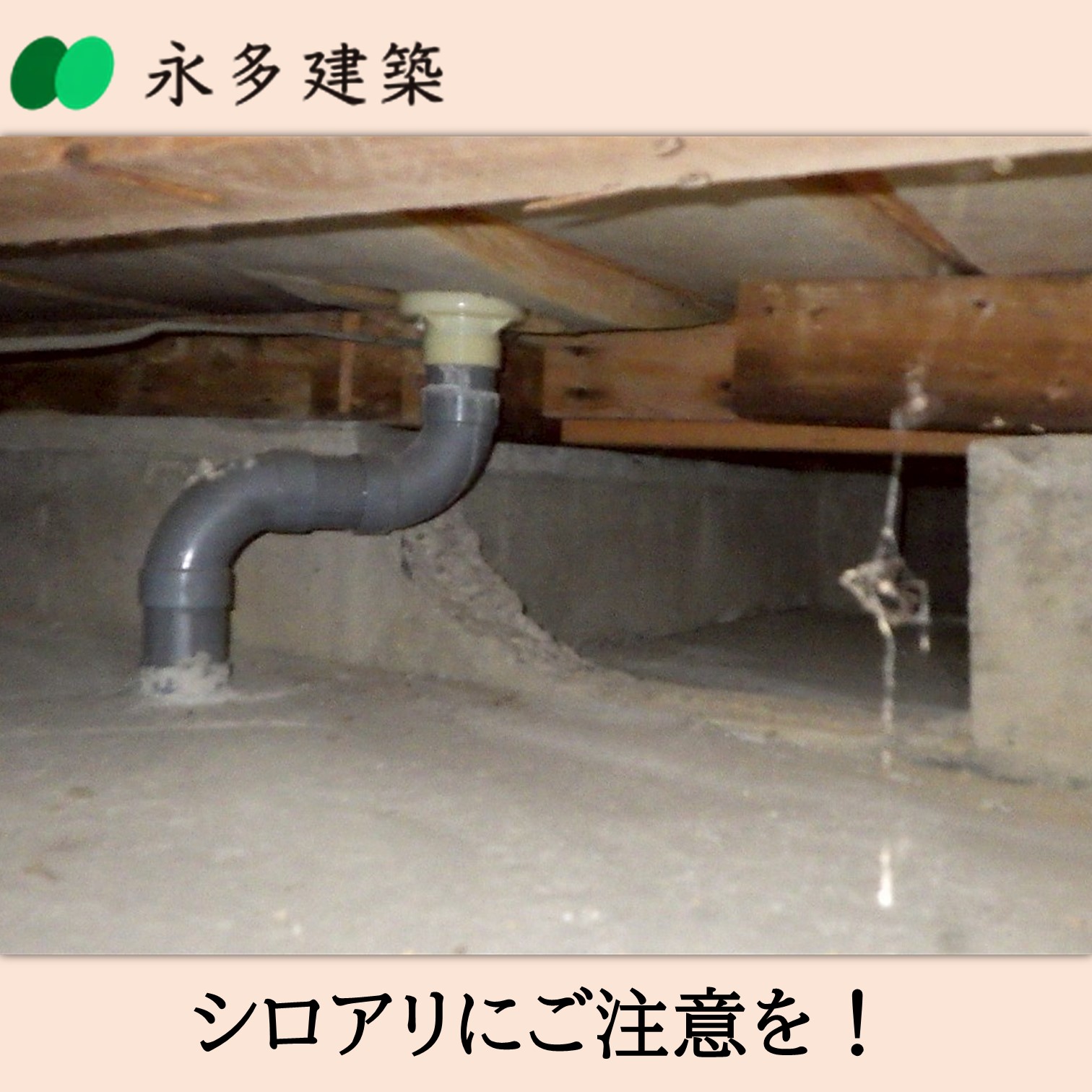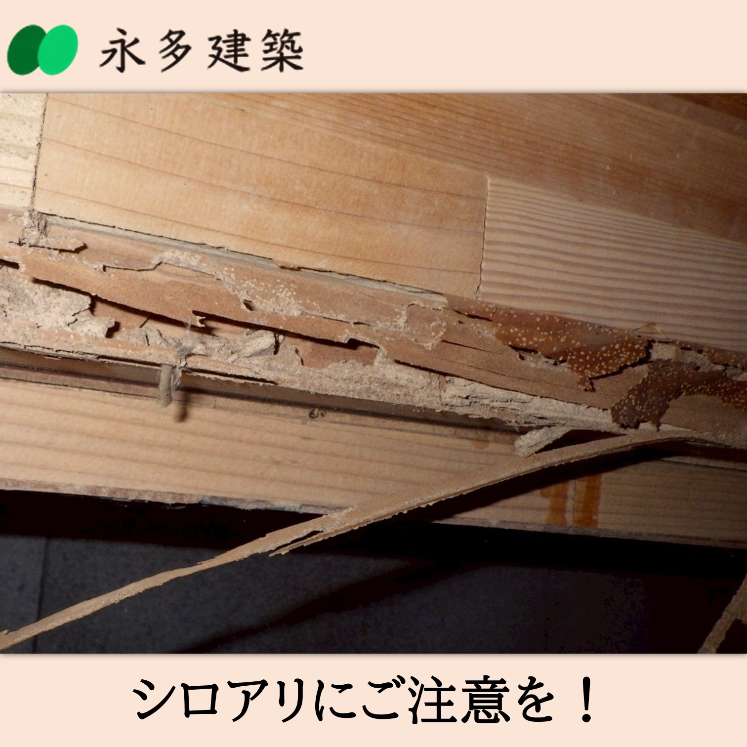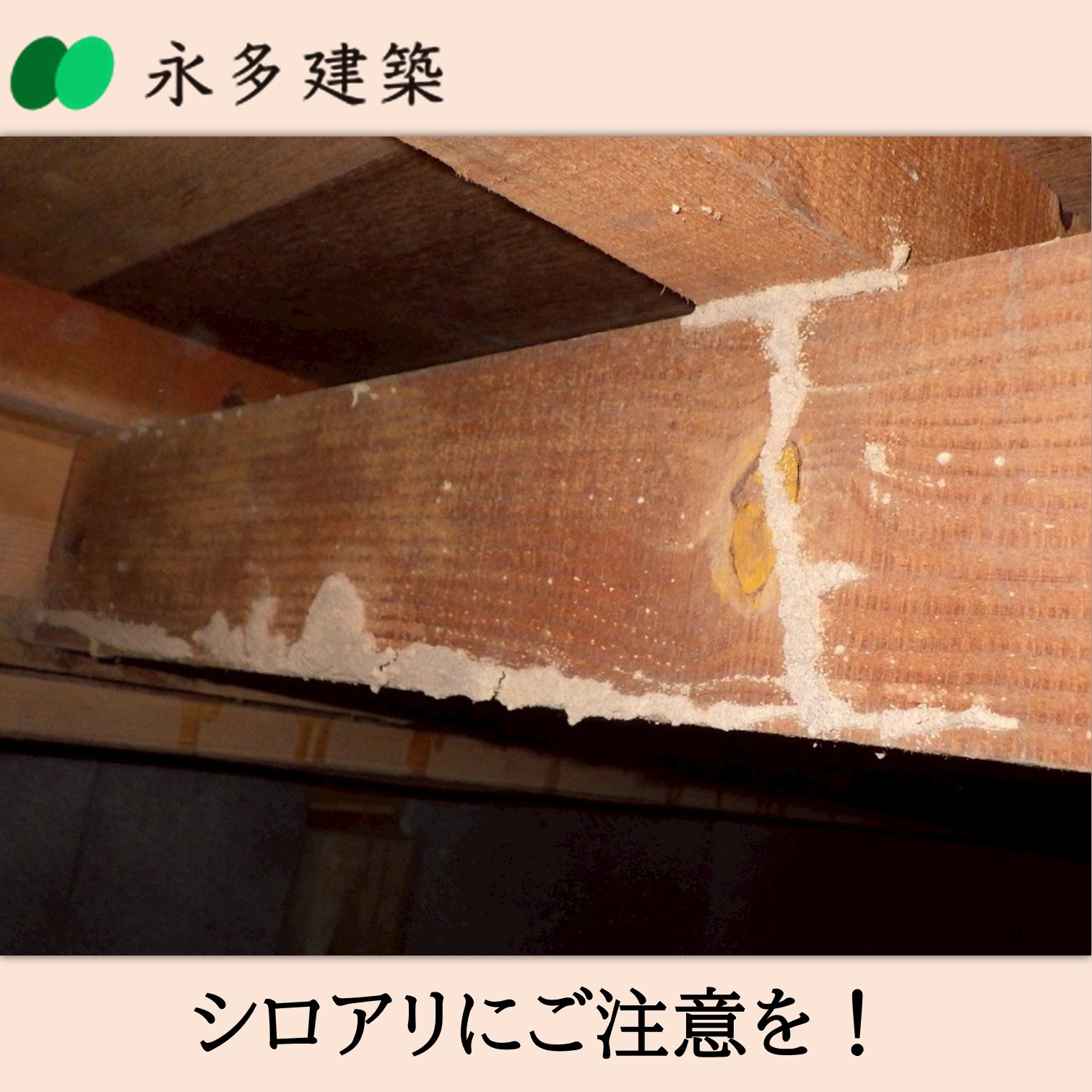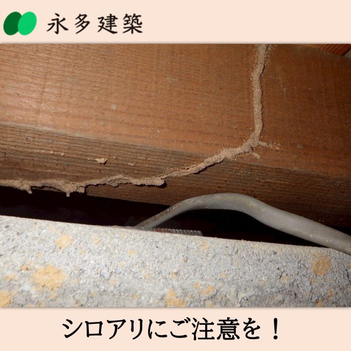 シロアリ被害 シロアリ被害・予防 新茶の季節になると暖かい陽気と同時にシロアリの動きも活発になります。ときどき床下や屋根裏などの点検し、薬などで予防をすることで被害を抑えられます。永多建築は住まいの総点検も無料で行っております。気になる方は遠慮なくお問い合わせください。◈新築・リフォームを検討中の方◈建築中の現場の見学をご希望の方◈建築業界で働きたい方ぜひ永多建築までご連絡ください永多建築有限会社袋井市新池1691-150538-42-9316