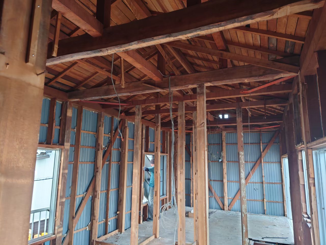 ↑ 外部構造面材を全面に貼り耐震強度も上げました。 (スケルトンでないとできない仕事。)
