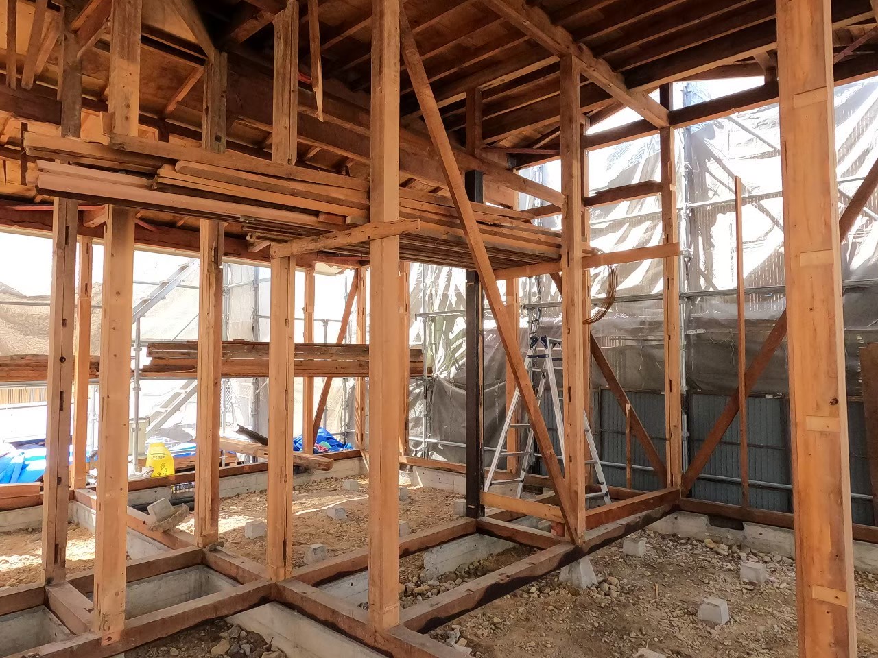↑ 内装・外壁をすべて撤去し、骨組みにします。 使える材料を判別し、心配な材料は交換!