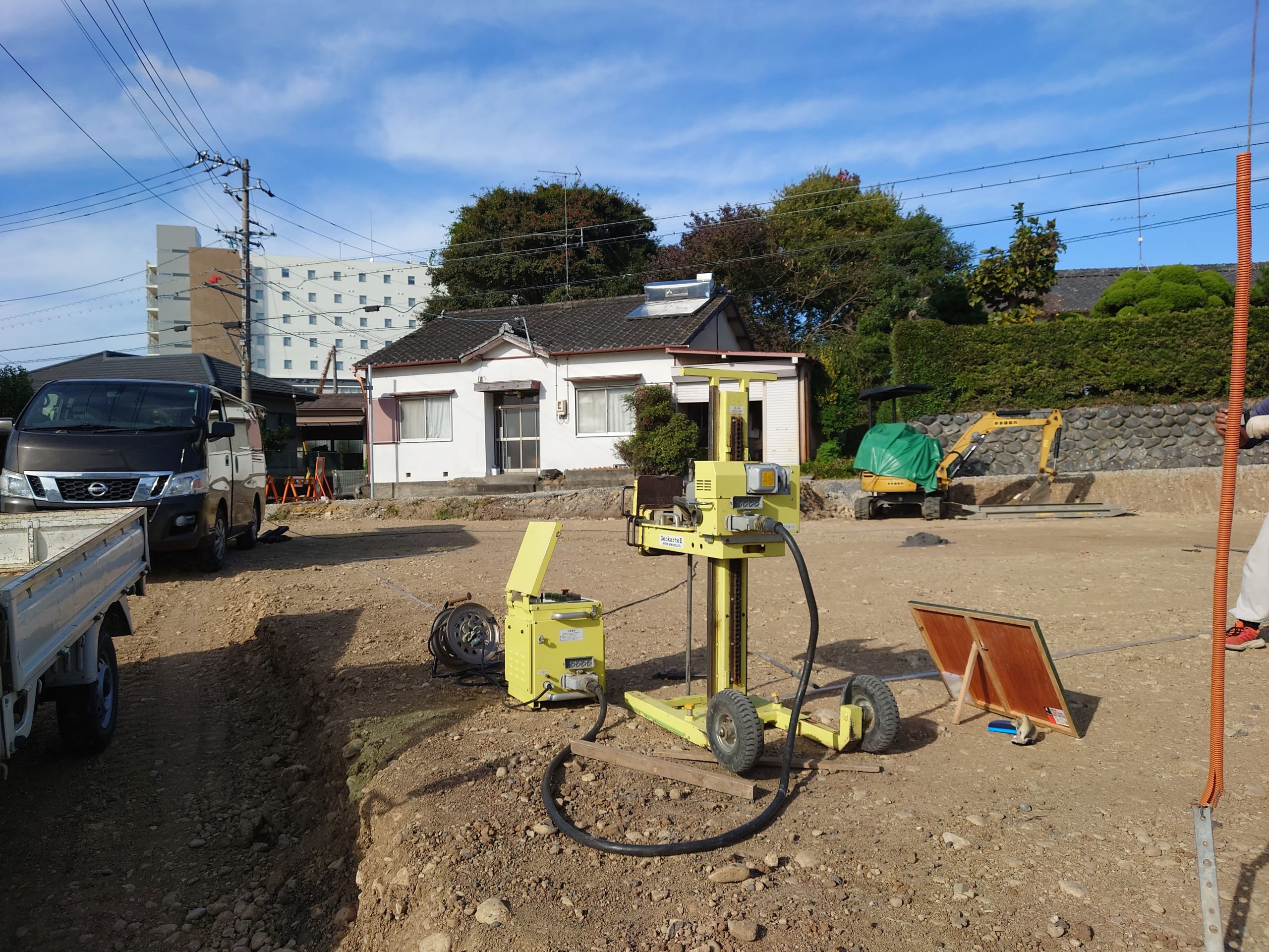 調査中 ロッド(鉄の棒)が折れるほど固い地盤でした。
