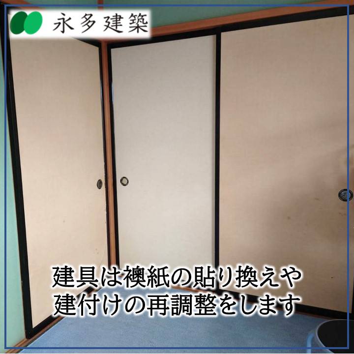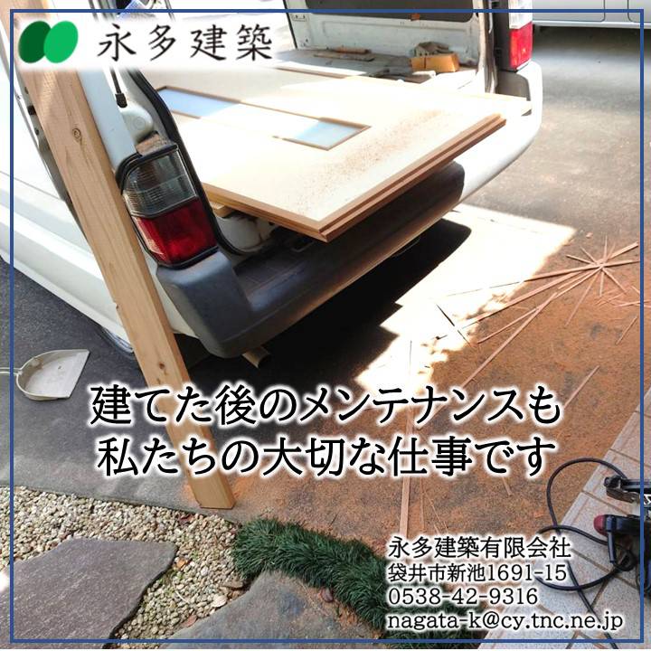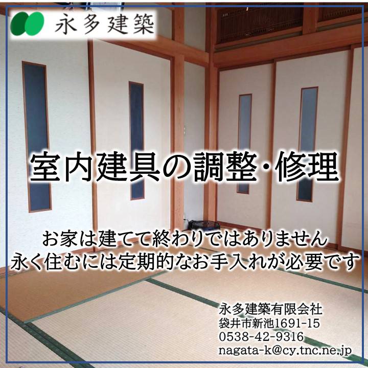建具の修理・調整 K様邸 袋井市祢宜弥OB客様より 建具の修理・調整依頼いただきました。お家は建ててから数十年、長ければ百年以上も住んで頂くものです。永く快適にお住まい頂くためには、定期的にお手入れをする必要があります。永多建築はお引渡ししてからが本当のお付合いの始まりだと考えています。建てた後のメンテナンスも永多建築にお任せください。