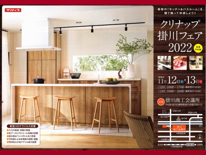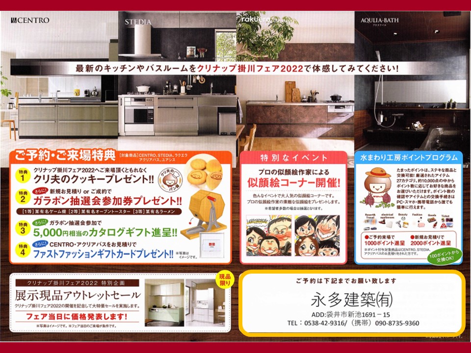 掛川フェア          掛川市商工会議所 11月12日・13日に掛川市商工会議所でクリナップさんのイベントがあります! 最新のキッチンやバスルームを見て触れる良い機会です! 参加を希望される方は永多建築までご連絡ください。 永多建築有限会社 静岡県袋井市新池1691-15 0538-42-9316      三浦まで 090-8735-9360