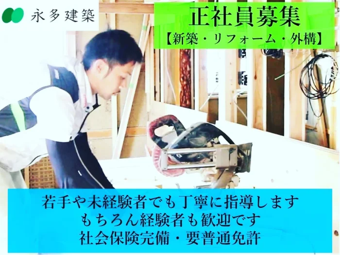 正社員募集 職人の高齢化で若者の力が必要です。永多建築有限会社は比較的社員年齢が若いです。。今のところお客様の財産を責任もってメンテナンスできますが、次の時代に向けて 若手の育成をも考えております。ものづくりに興味がある若者! 私たちと一緒にものづくりしませんか? 経験・未経験は問いません。 楽しい職場ですよ!数年後 大工や左官が今よりももっと少なくなり 仕事を頼まれる事間違いなし!永多建築は正社員で長く働いてくれる職人を募集しています!問合せフォームより ご連絡をお待ちしております。