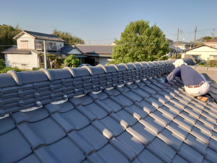 和風瓦屋根に見られる漆喰が劣化したため、やり替え工事しました。