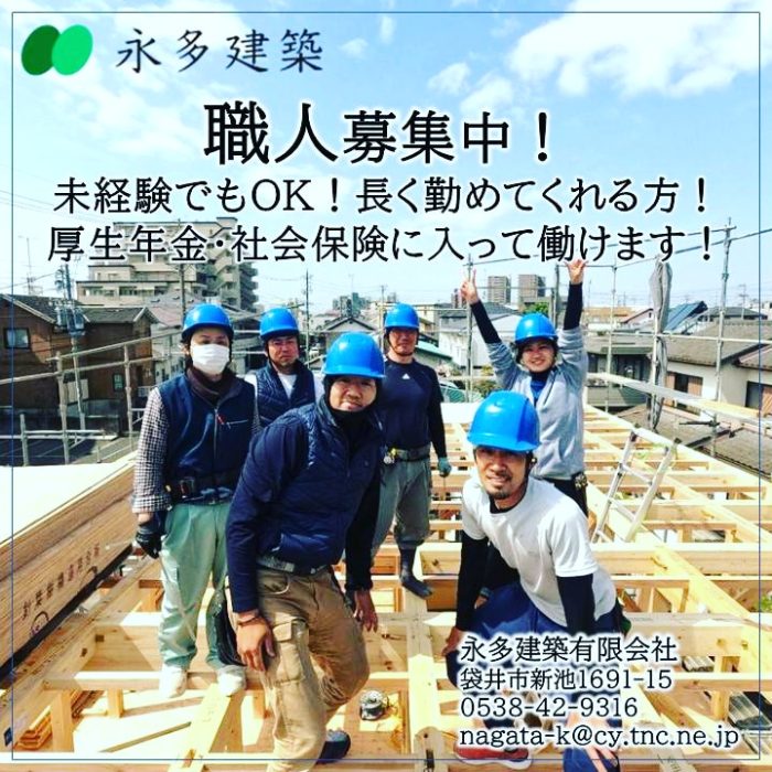 社員募集! 数年前から職人の高齢化とニュースやネットで話題に上がる事があるのです。そう! まさに 職人の高齢化現象が起きています。ものづくりに興味がある若者! 私たちと一緒にものづくりしませんか?経験・未経験は問いません。 楽しい職場ですよ!数年後 大工や左官が今よりももっと少なくなり 仕事を頼まれる事間違いなし!永多建築は正社員で長く働いてくれる職人を募集しています!問合せフォームより ご連絡をお待ちしております。