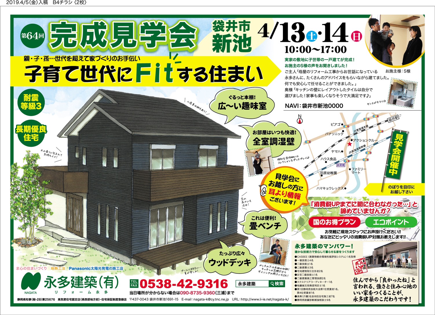 第64回 完成現場見学会 第64回 完成現場見学会 雨天開催 地域型グリーン化事業 (長期優良住宅) 場所 静岡県袋井市新池778 現場周辺に旗を建てております。予約されてない方でもお気軽にお越しくださいませ。 日時 4/13(土)10:00~16:00 4/14(日) 10:00~16:00 事前予約受付状況 4/13 (土) 4/14 (日) 10:00~ 予約済 10:00~ 予約済 11:00~ 予約済 11:00~ 予約済 13:00~ 予約済 13:00~ 14:00~ 14:00~ 予約済 15:00~ 15:00~ 16:00~ 16:00~ ※予約された方には当日特典があります。 ※当日 他社図面や見積りの資料をお持ち頂いた新規のお客様、相見積もり大歓迎です。 収納力のある 趣味室