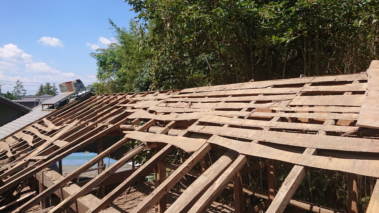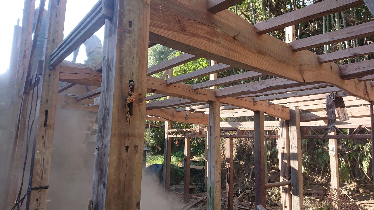 ↑ 手前の庇を解体します。 庇を潰した時、庇に乗ってた屋根土がすごい埃になりました。。。(゚Д゚)ノ