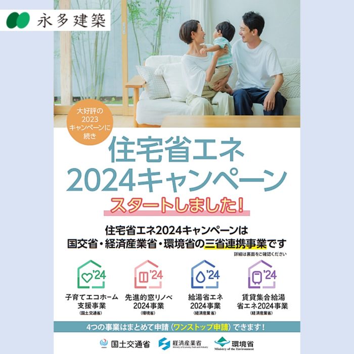 2024年度補助金制度 2024年度も省エネ性能の高い新築住宅や、省エネ性能を向上させるリフォームに使える 国の補助金制度が始まります。 永多建築ではこのような補助金事業を積極的に推進しています。 環境に配慮しながら、家計にも優しい住宅にご関心がある方は永多建築にぜひお問い合わせください! ◆新築・リフォームを検討中の方 ◆建築中の現場の見学をご希望の方 ◆建築業界で働きたい方 ぜひ永多建築までご連絡ください