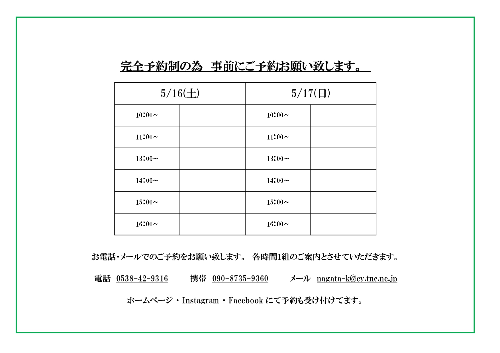 この度、新型コロナウィルスなど感染拡大を防止の為、当日は1時間1組の完全予約制とさせていただきます。 ご予約はメール・電話でのご連絡を受け付けております。お早めのご予定をお願い致します。 予約は先着とさせていただきます為 ご了承お願いします。 5/16 ㈯ 10:00~ 11:00~ 13:00~ 14:00~ 15:00~ 16:00~ 5/17 ㈰ 10:00~ 11:00~ 13:00~ 14:00~ 15:00~ 16:00~ 電話が繋がらない場合はこちらにお願いします。 携帯090-8735-9360 (担当 三浦まで) ※当日は現場に 手袋、消毒液は用意させていただきます。 ※マスクはご持参くださいますよう宜しくお願い致します。 ※当日はスタッフを少人数での対応とさせていただきます。