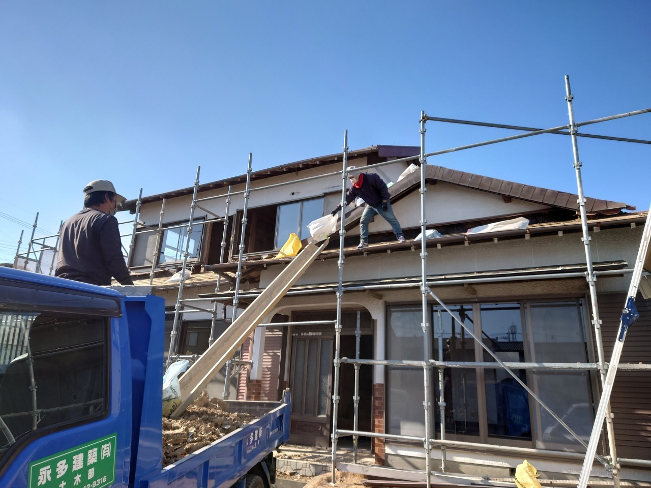 ↑ 瓦を降ろし 手バラシで解体していきます。