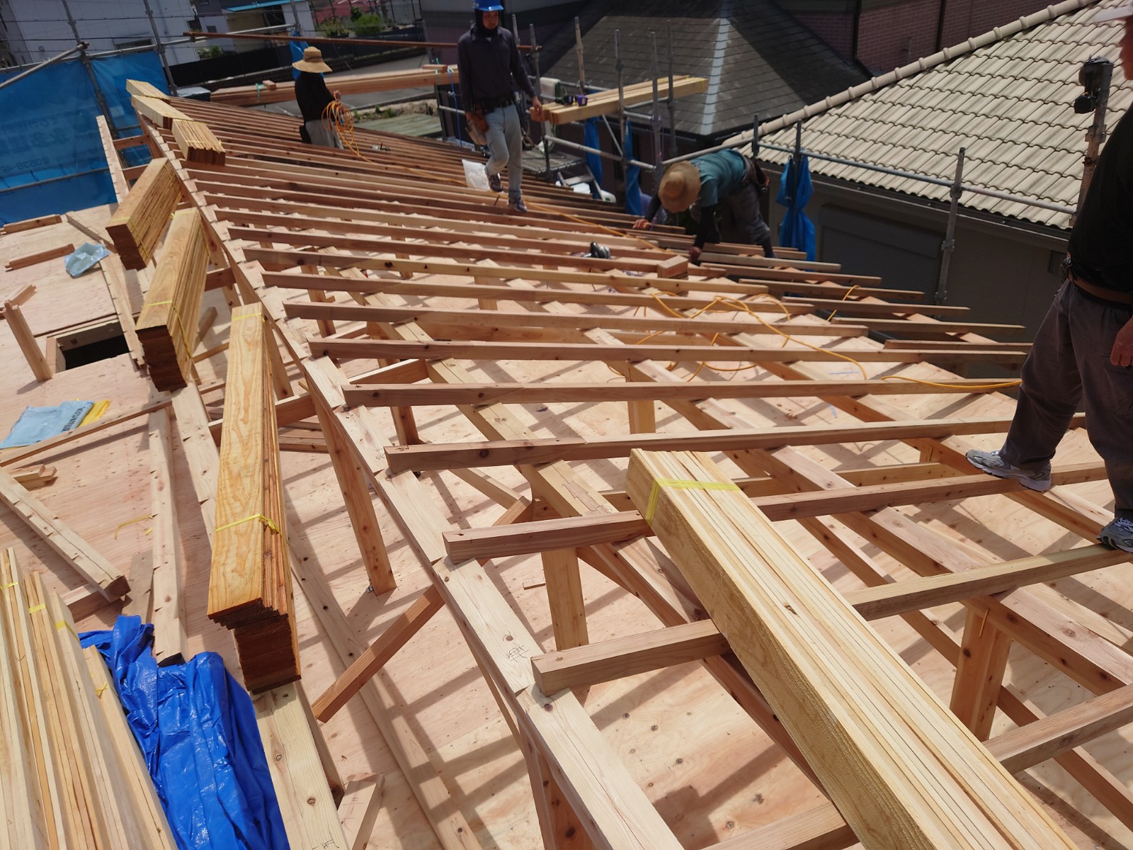 I様邸新築工事 上棟 I様邸 袋井市高尾こんにちは、5月吉日にI様邸上棟を行いました。https://test.nagata-k.net/wp-content/uploads/2023/05/f56a59ff99e316aca5f8d45bfa1c4202.mp4↑ タイムラプスで上棟まで。↑ 建方風景↑ 屋根下地組み↑ ルーフィング工事↑ 無事、上棟式ができました。 これからも最高の家作ります!