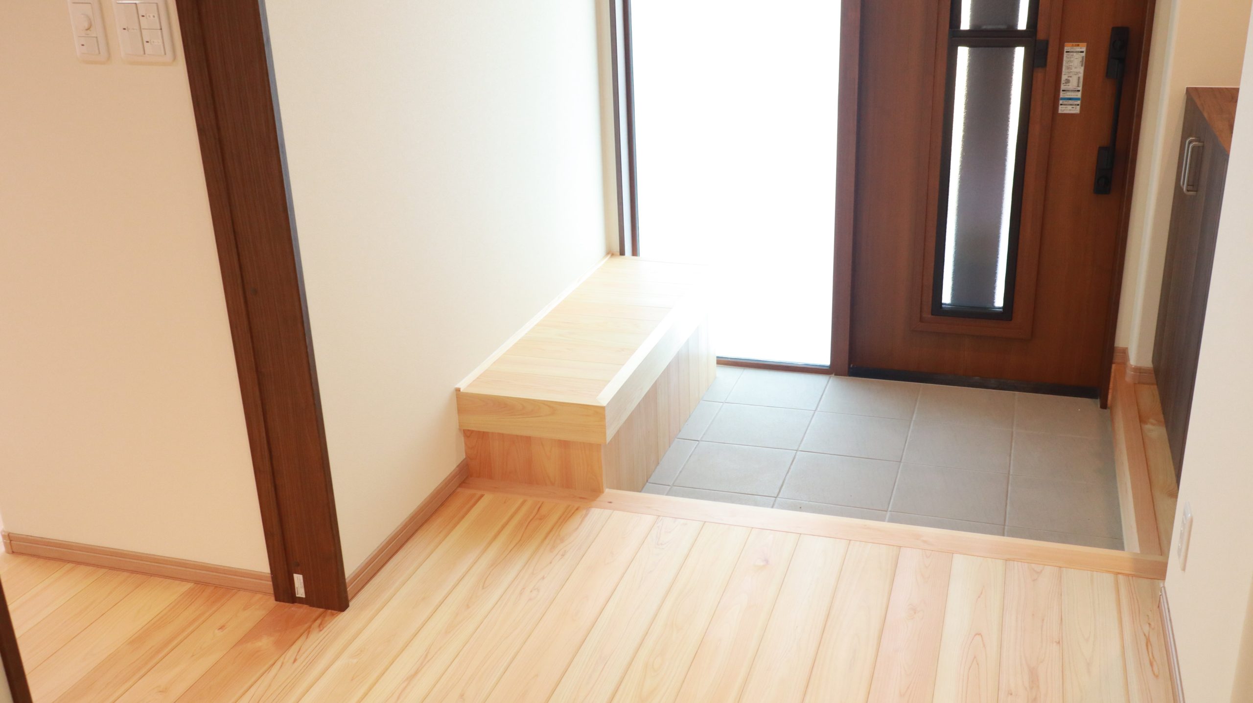 ↑ 家全体に桧の床板を使い 玄関に入ると 桧の香りが心地いいです。