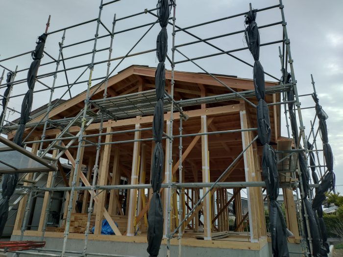 当日は天気は曇り/雨 雨が降ってくる前に屋根は完成していたので濡れずに済みました。